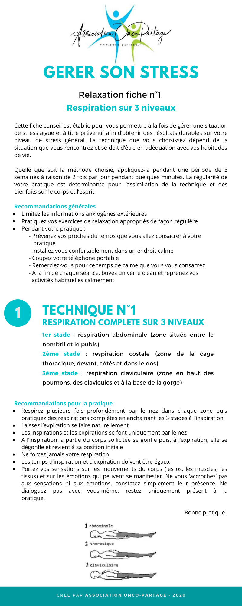 - Respirez plusieurs fois profondément par le nez dans chaque zone puis pratiquez des respirations complètes en enchainant les 3 stades à l’inspiration